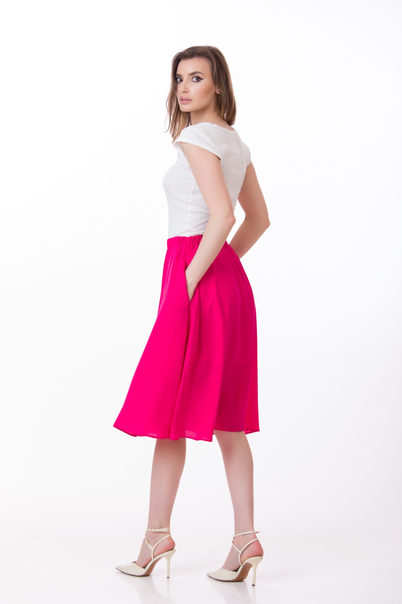 Fustă damă fucsia Be You midi cu talie elastică și buzunare – fabricată în România