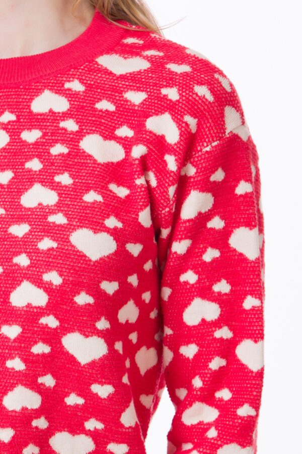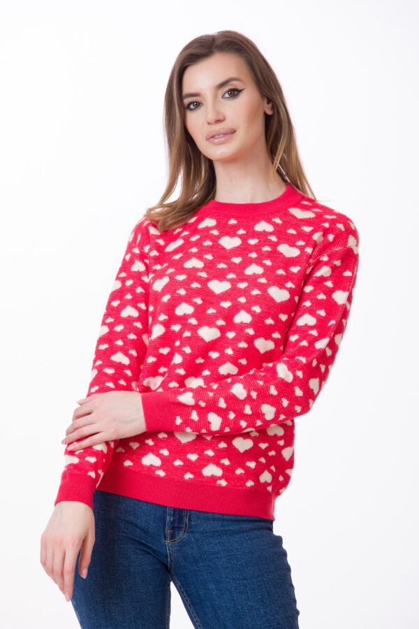 Pulover damă din lână 100%, roșu cu inimioare albe | Be You